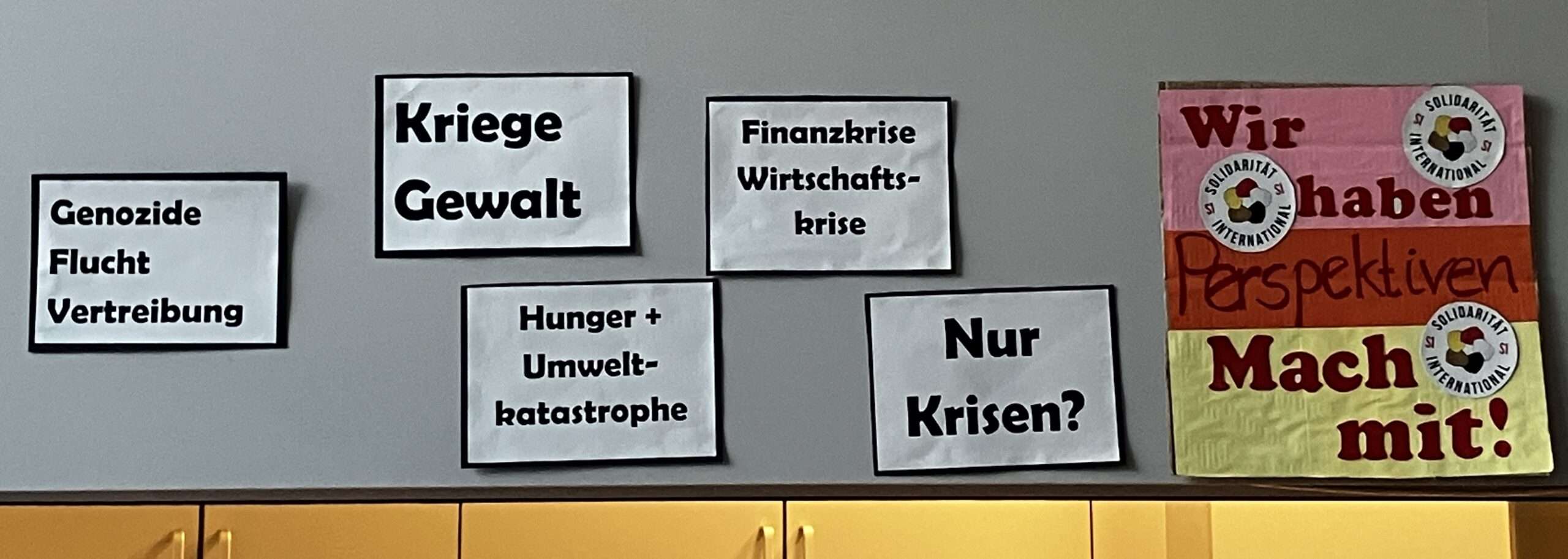 Thema war auch das Projekt auf Kara Tepe, wir hatten Besuch von der Umweltgewerkschaft. Aber wir sind so verblieben, dass wir dazu erst Spenden sammeln wollen wenn wir aktuelle Informationen bekommen wofür im Moment genau gesammelt wird und wie der Stand mit dem Recycling-Projekt ist. Hierzu wird es bald ein Update geben, daher haben wir das Projekt für unsere Sammlung heute zurückgestellt und beschlossen das Geld für Mozambique und Jenin zu verwenden. Toll war das Plakat der Ortsgruppe Braunschweig: „Nur Krisen?“ -Wir haben Perspektiven, Mach mit!“, was wir nachgebastelt haben.